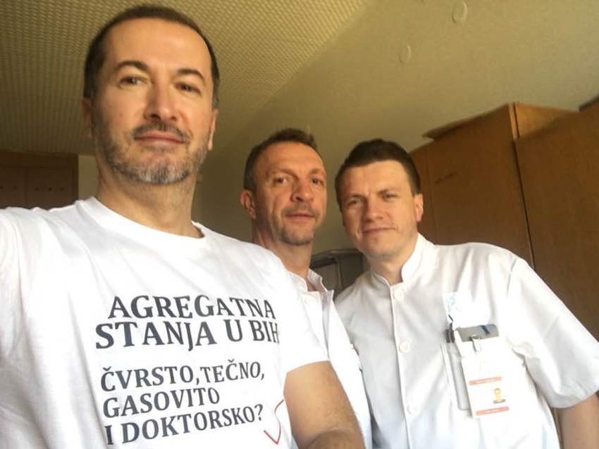 Bivši uposlenici Klinike za ortopediju i traumatologiju KCUS-a, a sada ljekari Opće bolnice Hasan Tanović, Senad Maksić i Semin Bećirbegović su danas objavili selfie dok je jedan od njih nosio majicu s natpisom "Agregatna stanja u BiH: čvrsto, tečno, gasovito i doktorsko?".
