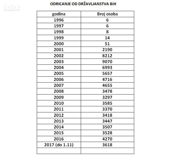 Najviše građana državljanstva se odreklo 2003. godine, čak 9.070, godinu ranije ih je bilo nešto manje – 8.212, a brojka se od 2003. počela postepeno smanjivati pa je tako 2004. iznosila 6.993, 2005. je bila 5.657, 2006. je bila 4.716, godinu kasnije 4.655, zatim 3.478, a nakon toga 3.297. Broj je 2010. blago skočio na 3.585, da bi godinu nakon toga pao na 3.370. Trend povećanja broja građana koji su se odrekli bh. državljanstva počeo se bilježiti od 2012. godine do danas i po godinama se kretao ovako – 3.418, 3.447, 3.507, 3.528, 4.270 i za deset mjeseci ove godine 3.618.